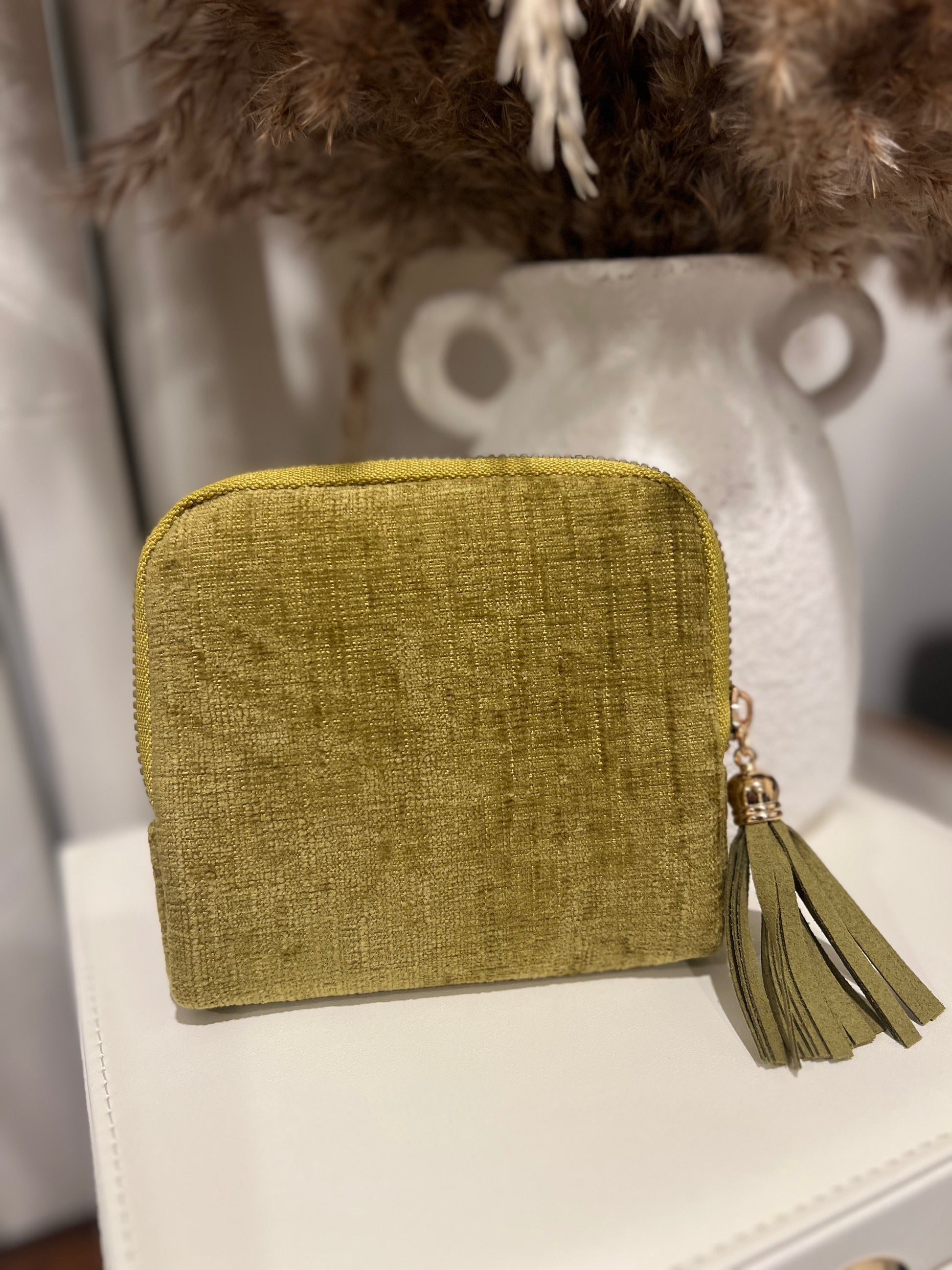 Crafted from a soft, high-quality fabric with a rich chenille-like texture, this pouch features a shimmering finish that catches the light beautifully. The compact square shape is perfect for tossing into a tote bag or suitcase, keeping your necklaces, earrings, and rings secure while on the go. It is finished with a smooth-gliding gold-tone zipper and a playful matching tassel pull for a touch of bohemian luxury.