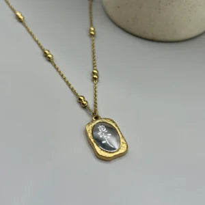 The Rose Necklace is a poetic blend of vintage and modern. Its oval-shaped pendant features a softly etched rose under a domed glass-like finish, encased in an organic-shaped, hammered gold frame. The beaded gold chain adds a delicate rhythm to the design, making this necklace feel extra special.